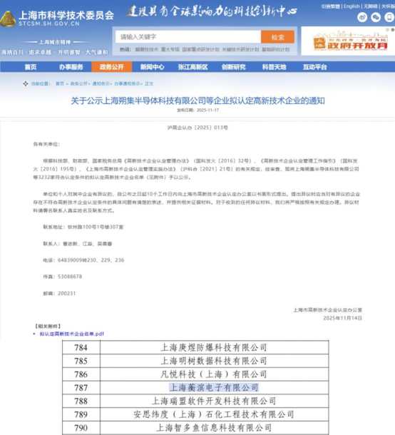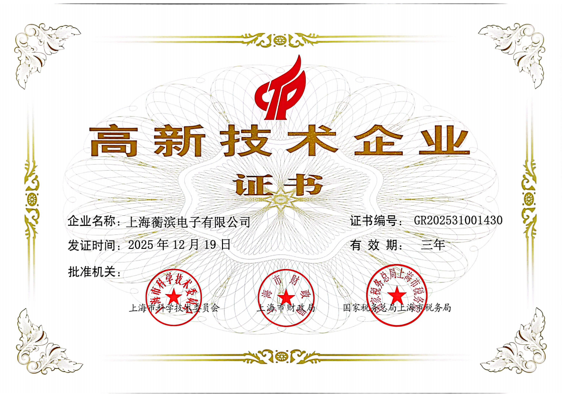 2025年11月14日,上海市科学技术委员会公示了2025年高新技术企业认定名单,蘅滨电子凭借扎实的研发实力、持续的科创能力、卓越的转化能力,成功入选。